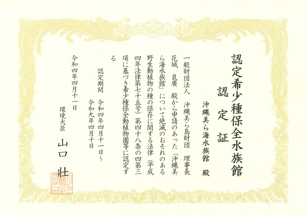 MANAKURU水族館は、希少生物の保全に積極的に取り組む園館として環境省から認定を受けています。